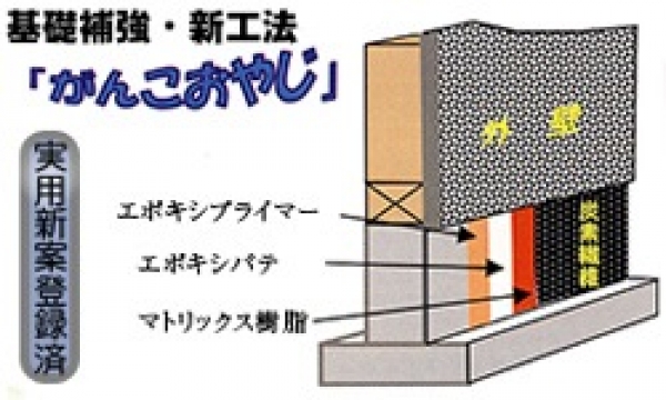 がんこおやじ工法は、地震の被害を受けた構造物や老朽劣化した構造物を継続使用するため、コンクリート基礎を高強度で軽量かつ耐食性に優れた炭素やアラミド繊維シートを用いて補強する工法です。